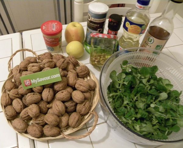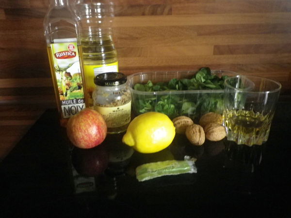 Nous adorons la mâche. La sauce était très goûteuse et agréable. Bonne idée pour du croquant avec les noix mais nous n'avons pas aimé l'ajout de pomme, nous aurions préféré des petits morceaux de charcuterie.