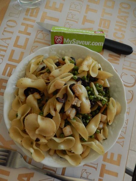 Une fois les calamars cuits, mettez les pâtes dans la sauteuse, les petits pois et les olives, et mélangez pendant 2 min.