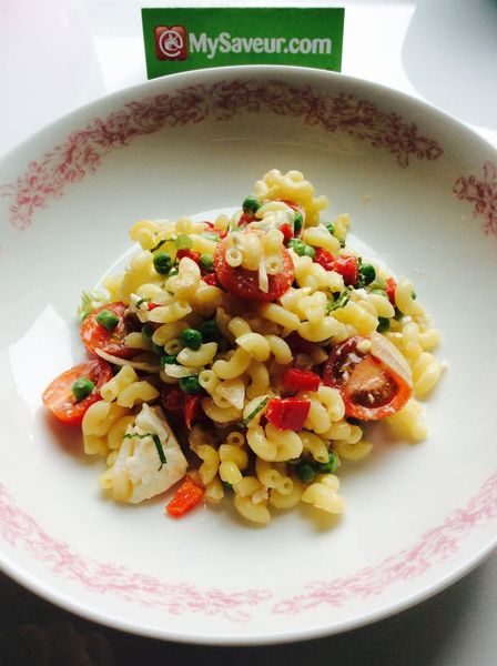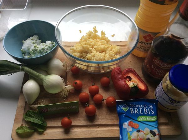 Ajouter les pâtes, la féta émiettée, les tomates cerises coupées en deux, le poivron, les petits pois et l'oignon ciselé.