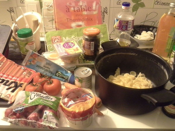 - 4 à 5 knackis (ou 120 à 180 g de dés de jambon ou jambon de votre choix coupés) ou un mélange saucisses, jambon, ...