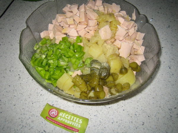 Bonne salade, mais trop sèche pour nous (j'ai rajouté de la vinaigrette) et j'aurais mis des tomates et des échalotes.