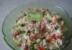Une recette très facile à faire. Par contre, je n'ai mis que du poivron vert pour ne pas gaspiller l'autre moitié du coup je n'ai pas mis de poivron rouge. J'ai trouvé qu'il y avait vraiment trop de garniture comparé au riz. J'ai trouvé cela très originale de mettre du concombre mais personnellement nous n'avons pas vraiment aimé.