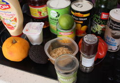 - La sauce : 1/2 yaourt brassé, 2 càs rases de mayonnaise, 1 càs de vinaigre, (1 càc de moutarde), sel, poivre, jus d'1 citron, (2 càs bombée de sauce soja).