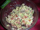 - Sauce : 1/2 pot de yaourt brassé ou fromage blanc (O%) (+ de la ricotta), moutarde (à doser selon votre goût, pour moi 2 càs car c'est de la moutarde douce), (1 càc de mayonnaise), un peu de jus de citron, vinaigre, sel, poivre, (persil et ciboulette).