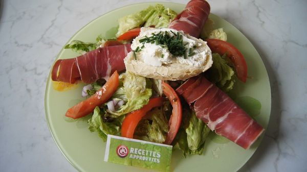 Très bonne salade, c'est très frais et léger. Les toasts au fromage frais en font un plat complet. J'ai mis un mélange de batavia et de laitue iceberg. À refaire.