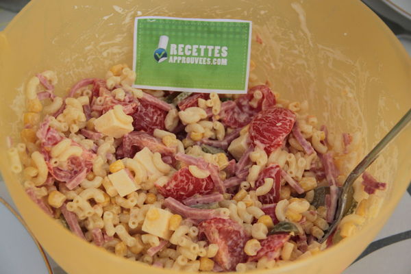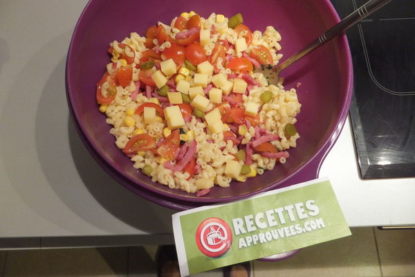 Bonne salade mais je trouve qu'elle est mal équilibrée, il y a trop de féculents (pâtes et maïs) et pas assez de légumes. De plus, j'aurais plutôt mis des dés de jambon à la place du bacon. Mais l'ensemble est très bon et nous avons apprécié.