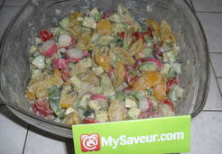 Dans un premier temps préparer l'assaisonnement en mélangeant le fromage blanc, le vinaigre, l'huile, la sarriette, l'oignon rouge finement ciselé. Saler et poivrer.