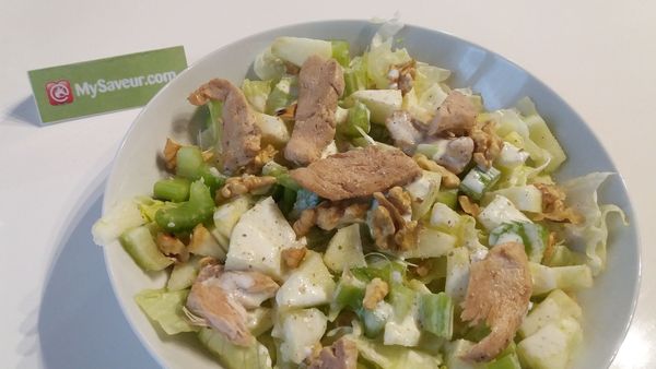 Verser le reste de la sauce sur le mélange pomme/céleri/noix et bien mélanger le tout avant de les disposer sur la salade.