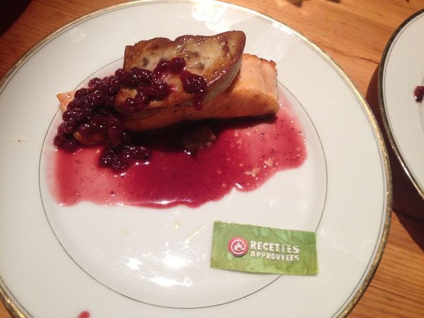 Dans votre assiette, dresser le saumon, puis la tranche de foie gras au dessus.