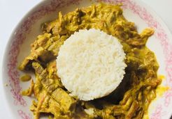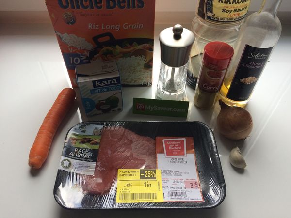 Quand l'oignon, est translucide ajouter les carottes grossièrement râpées, le curry, le lait de coco, la sauce soja et saler. Ajouter enfin la viande coupée en lamelles et laisser mijoter à feu moyen une dizaine de min.