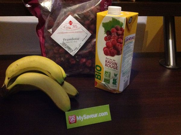 Dans un blender mettre la banane avec les framboises et le jus de raisin. Mixer jusqu'à obtenir un mélange homogène.