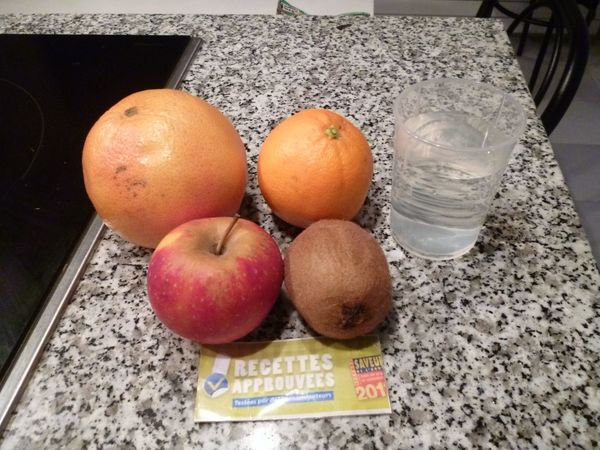 Je n'ai quasiment pas rajouté d'eau, le smoothie étant très bon tel quel. Par contre, j'aurais préféré presser l'orange et le pamplemousse puis rajouter le jus et la pulpe au mélange pomme-kiwi avant de mixer. Je trouve que cela est plus rapide que d'éplucher les agrumes.
