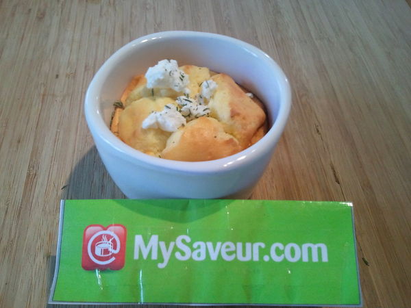 Un très bon soufflé, de bonne consistance. Bonne association entre les fromages et le thym. J'ai juste oublié de mettre un peu de fromage blanc dessus.