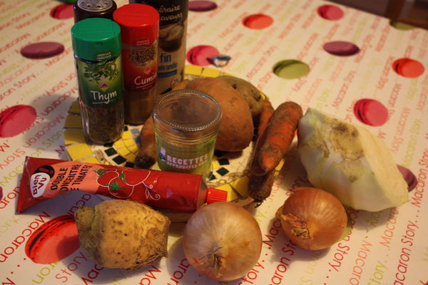 - Epices : 1 bonne pincée de thym, 1 petite pincée de cumin, sel, poivre