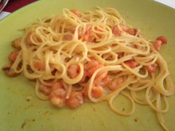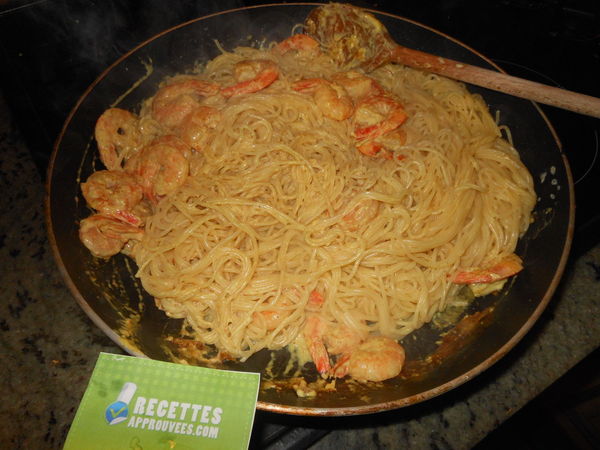 Bonne association curry/crevette. Repas complet et rapide avec les spaghettis. J'ai rajouté des échallotes pour plus de gout.