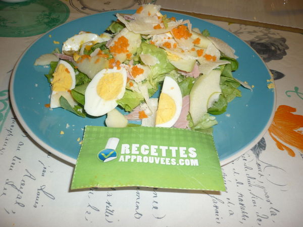 dresser votre salade sur un plat ou dans un saladier , mettre le jambon , oeufs , jambon , graines , pomme, parmigiano