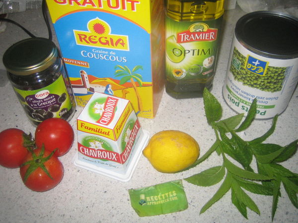 Un taboulé bien frais grâce au chèvre frais et à la menthe. Les petits pois se font discrets. Quelques raisins secs auraient été agréables avec le chèvre.