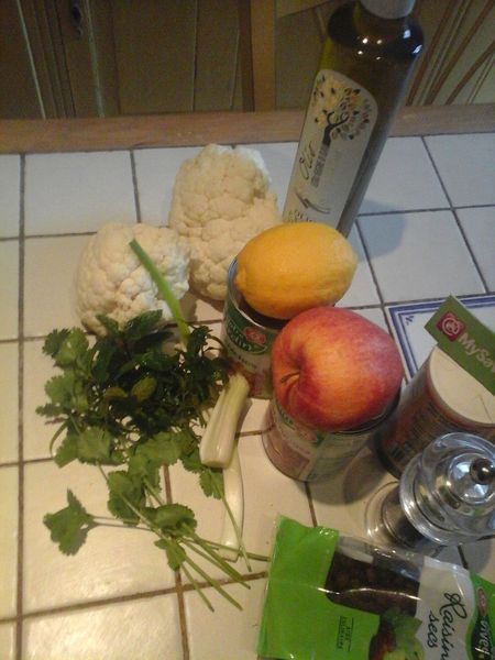 Mixer le chou-fleur, émincer l'oignon blanc, éplucher la pomme et la couper en dés.
