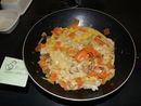 - huile d'olives, 1 oignon, 1 Kg d 'escaloppes de poulet ou de dinde coupés en dés, 3 carottes rapées très gros, 2 petites cougettes rapées très gros , des cépes, 1 petite boite de champignons de paris, sel, poivre, maggi, 2 briques de crème UHT, 500 g de tagliatelles