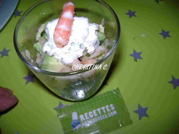 « Les 2 étapes d'attente s'enchainent bien. Astuce pour couper l'avocat en dès : Ne pas enlever la peau, la quadriller en diagonale vers les deux sens à l'aide d'un couteau d'office sans perforer la peau puis avec une cuillère à soupe, détacher les cubes de chair de la peau de l'avocat en passant entre les deux. Peut aussi servir d'entrée froide pour 4 personnes, à dresser avec un cercle dans une assiette. »