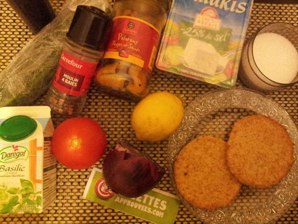 - Environ 60 ou 80 g de feta nature coupée en petits morceaux ou émiettée