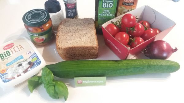 Une jolie entrée que nous avons beaucoup appréciée. Il est vrai que le pain a tendance à s'imbiber très vite du jus des légumes et à ramollir mais ce n'est pas désagréable à la dégustation, même si un petit côté croustillant aurait été le bienvenu. La salade de légumes à la feta est délicieuse, bien rehaussée par le poivron grillé.