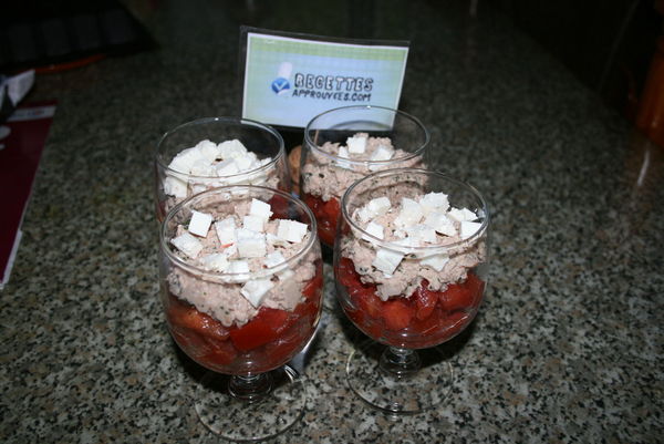 Bonne verrine, fraîche mais la mayonnaise n'apparait plus dans la recette alors je l'ai mise avec le thon et je n'ai pas trop aimé la feta.