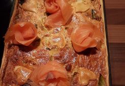 Avant de servir, couper, dans le sens de la longueur le saumon fumé et enrouler la tranches afin de former des roses. Déposer sur la tarte et servir.
