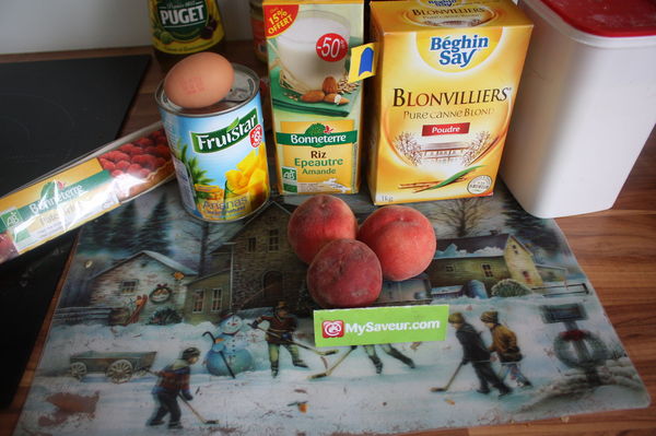 Disposer les tranches de pêches comme pour une tarte aux pommes et parsemer l'ananas par-dessus.