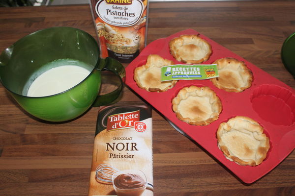 Des tartelettes simples et rapides à réaliser. Bien chocolatées. La prochaine fois, je rajouterai de l'arôme à la pistache dans le chocolat pour relever la saveur de ces tartelettes.