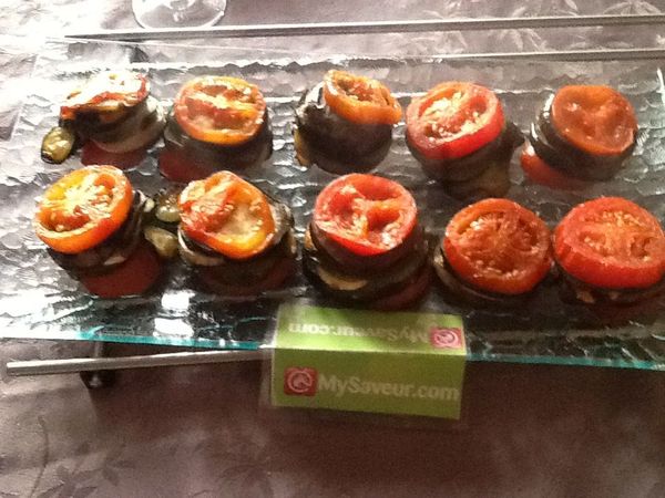 Mettre une tranche de tomate, puis d'aubergine, 1/2 feuille de basilic, 1 tranche de courgette, une tranche de fromage et recommencer pour finir avec une tomate.