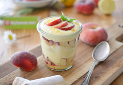 Filmer et laisser au frais au moins 2 heures. Au moment de servir, décorer avec quelques lamelles de pêches et écorces de citron confit.