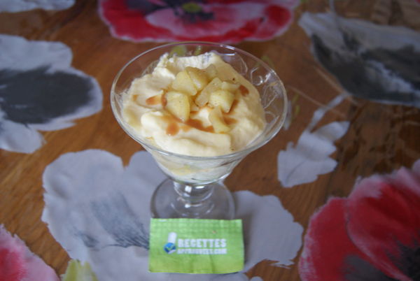 Les pommes sont bien fondantes. La préparation mascarpone et crème fraîche est un peu lourde, il manque de légèreté. C'était bon, mais je préfère avec le vrai tiramisu. J'ai oublié de mettre le vermicelle et les pépites de chocolat.