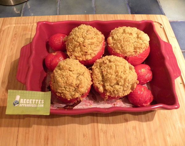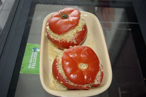 Cette façon de cuisiner la tomate est très originale ! Nous avons adoré le mélange oignon-herbes dans la semoule, ça lui donne un parfum délicieux. Comme tous les testeurs ont signalé que ce plat était sec, j'ai ajouté quelques tomates cerises pour apporter un peu plus de jus mais au final, la tomate se suffit à elle-même si elle est bien pulpeuse. La cacahuète apporte un peu de croquant bien sympa.
