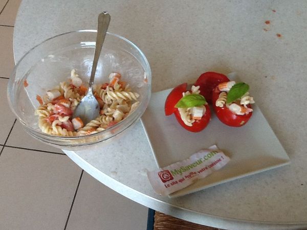 C'est simple, rapide, beau et goûteux ! L'assemblage pâte (pour ma part à la spiruline)-surimi est délicieux ! Et l'assaisonnement est bien relevé grâce au piment ! Chouette idée pour utiliser un reste de pâtes cuites! J'ai adoré et dévoré ces tomates farcies ! Je les ai servies sur un lit de roquette avec un supplément de farce : cela donne un repas du soir succulent et complet !