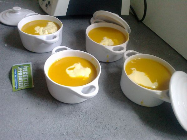 Par contre, les quantités, bof...j'ai mis 1 litre d'eau et heureusement car j'aurais obtenu une purée plutôt qu'une soupe, et pour l'émulsion j'ai mis une brique de crème et 40g de chèvre (j'ai divisé les quantités par 3), très suffisant pour nos 4 assiettes. - 14/20