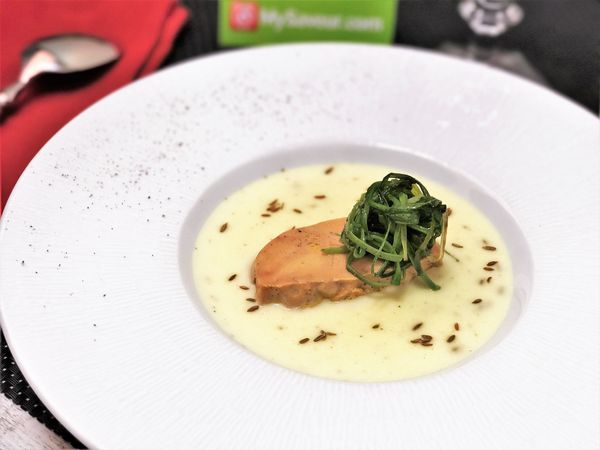 Dans une assiette creuse, verser le velouté puis déposer au centre 1 à 2 tranches de foie gras. Terminer avec quelques spaghettis de fanes sur le dessus et assaisonner. Vous pouvez rajouter des graines de cumin si vous le souhaitez.