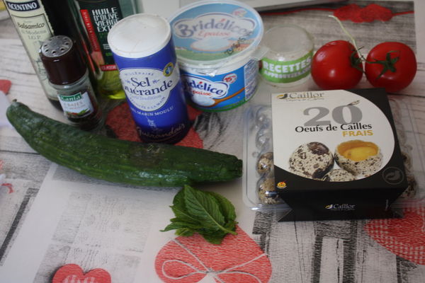 Entrée fraîche et qui change par sa présentation. Elle a plu à tout le monde avec ses petits oeufs de caille qui plaisent aux enfants.