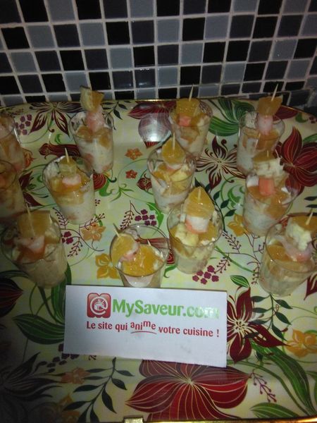 À l'aide de cure-dents faites de petites brochettes : 1 cube orange et 1 cube crevette que vous planterez sur le dessus de vos verrines (un cube orange sur le dessus).
