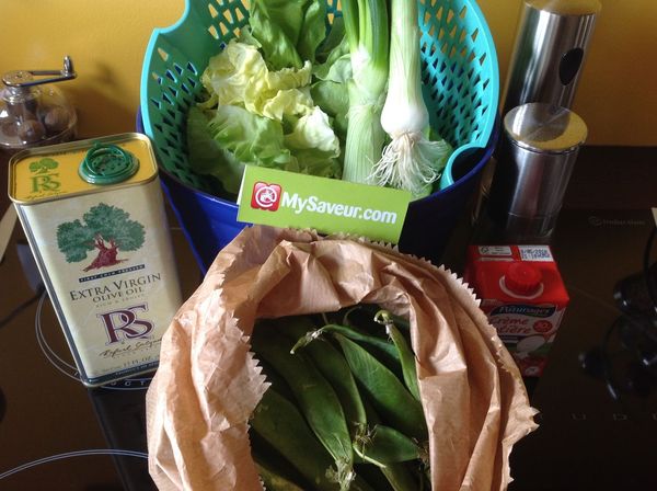 Faire fondre les oignons dans l'huile d'olive, puis ajouter la salade et les petits pois. Couvrir d'eau et saler. Laisser frémir 20 min.