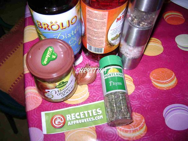 Une bonne vinaigrette, bien parfumée, on ne remarque pas qu'elle est "allégée". Il y a tout de même un peu trop de thym ! J'ai mis du vinaigre balsamique vu que le type n'était pas spécifié, et je n'ai plus de traditionnel.