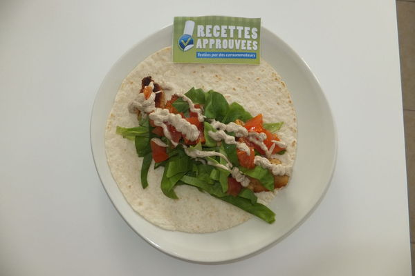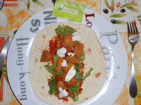 A la maison, j'avais l'habitude de manger les wraps maxicaines poulet ou boeuf à la sauce épicée. Je n'avais jamais pensé à tester au poulet panné. Quel succès à table! C'est délicieux. C'est frais avec les crudités et la sauce. Ça croustille et c'est gourmand grâce au poulet : à refaire et re-refaire. Variante avec sauce au poivre, ou sauce au roquefort ...