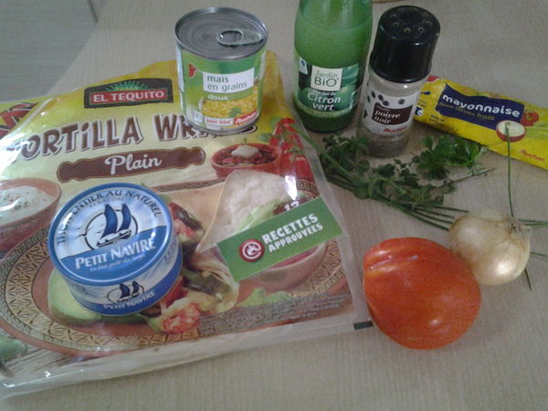 Je suis désolée, j'ai oublié de mettre ma petite boîte de maïs sur la photo des ingrédients. Je viens juste de m'en rendre compte, mais l'on voit très bien le maïs dans le wrap.